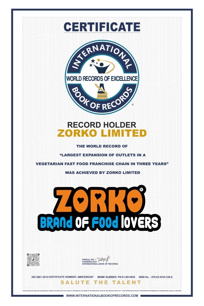 ZORKO Limited has officially entered the International Book of Records! Read about our journey to becoming the world’s fastest-growing vegetarian fast-food franchise, expanding to 400+ outlets.